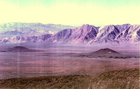 一名州立研究人员在尤卡山的山顶向西面的加州方向拍摄了这张照片。前景就是两个火山渣锥。
