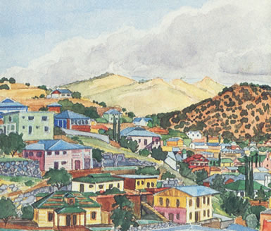 AT RISE : Late afternoon. Coronado resting; duffel bag pillow, football helmet beside him. Aura regarding painting, rinsing brush. SINE enters carrying pitcher and glasses.